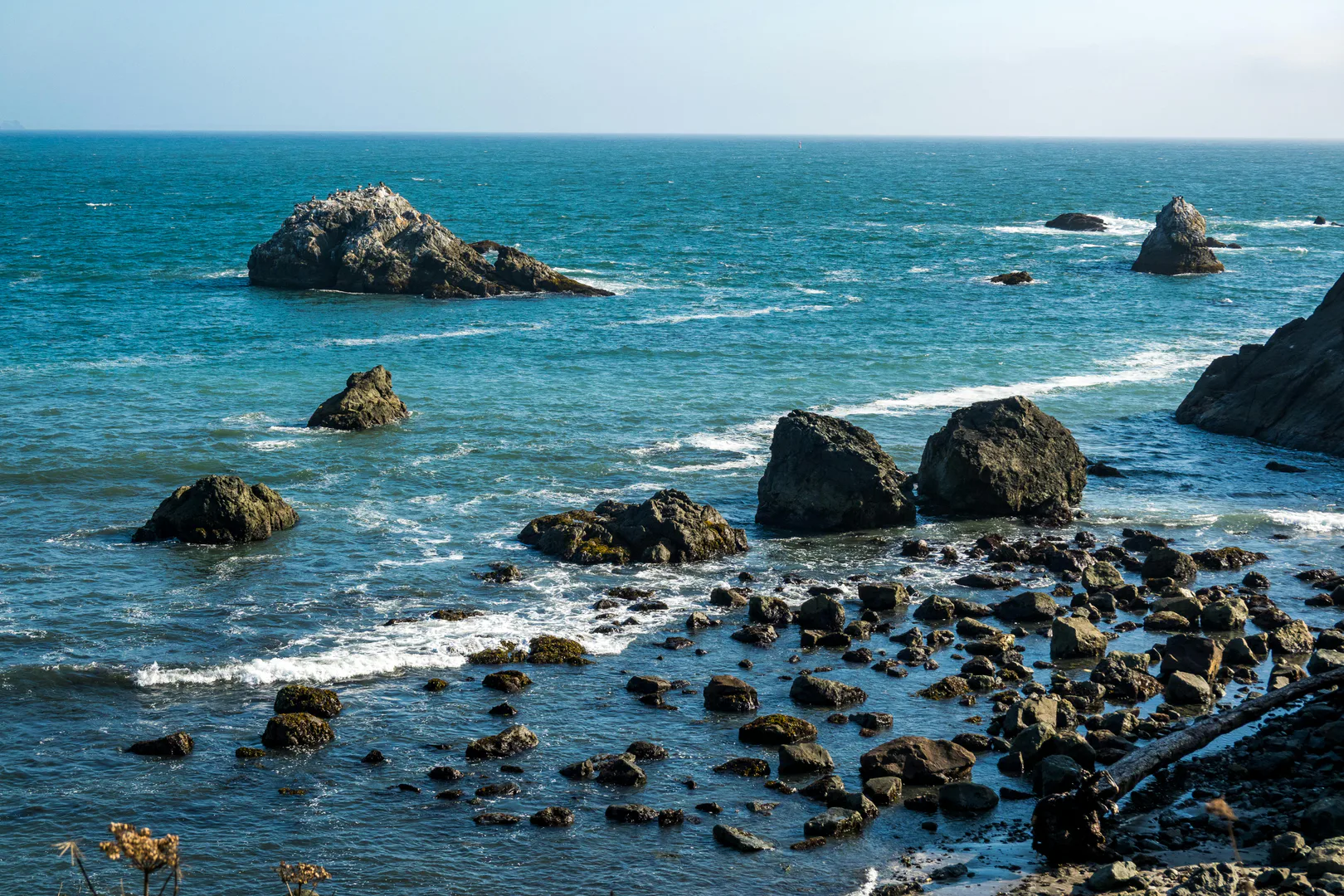 Mile-long sandy beach 8 miles south with swimming, tidal pools, and nature trails through coastal forest.
